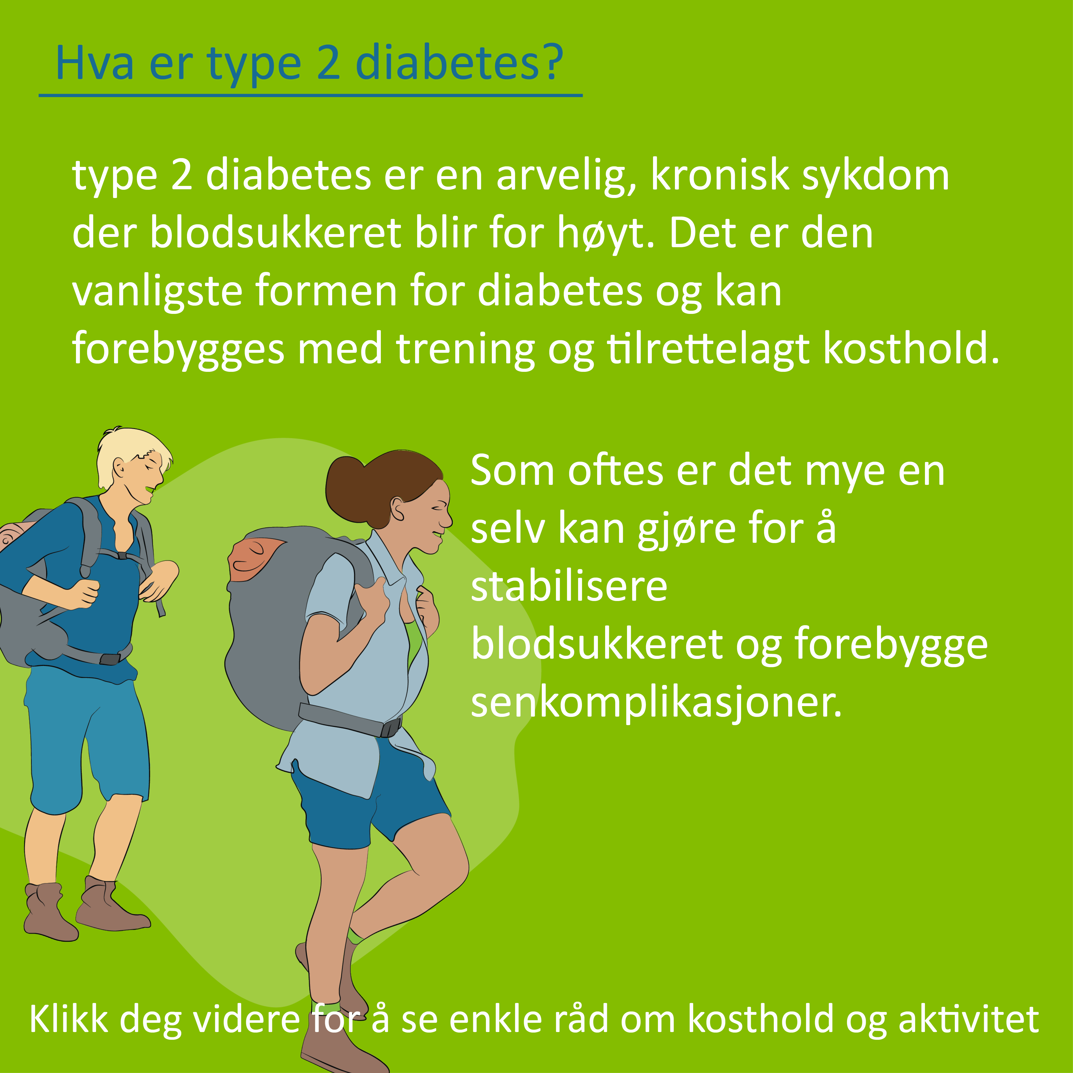 En samhandlingspakke med bakgrunn i forslagene. Samhandlingspakken består av en samling virkemidler som bevisstgjør innbyggere om de forskjellige opplærings- og oppfølgingstilbud som finnes for personer med type 2 diabetes.